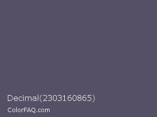 Decimal 2303160865 Color is a normal indigo color and the nearest color is Scarpa Flow #585562. Hex code #555065 and RGB value is rgb(85,80,101). In RGB color space, this color is composed of 33% red, 31% green, 40% blue, In CMYK color space, this color is composed of 16% cyan, 21% magenta, 0% yellow , 60% black , In HSL color space, this color has a hue angle of 254° , 12% saturation and 35% lightness.