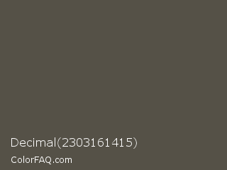 Decimal 2303161415 Color is a normal orange color and the nearest color is Fuscous Gray #54534d. Hex code #555147 and RGB value is rgb(85,81,71). In RGB color space, this color is composed of 33% red, 32% green, 28% blue, In CMYK color space, this color is composed of 0% cyan, 5% magenta, 16% yellow , 67% black , In HSL color space, this color has a hue angle of 43° , 9% saturation and 31% lightness.