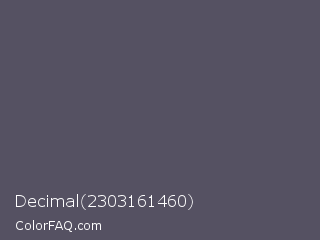 Decimal 2303161460 Color is a normal indigo color and the nearest color is Scarpa Flow #585562. Hex code #555162 and RGB value is rgb(85,81,98). In RGB color space, this color is composed of 33% red, 32% green, 38% blue, In CMYK color space, this color is composed of 13% cyan, 17% magenta, 0% yellow , 62% black , In HSL color space, this color has a hue angle of 254° , 9% saturation and 35% lightness.