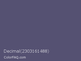 Decimal 2303161488 Color is a normal indigo color and the nearest color is Independence #4c516d. Hex code #555172 and RGB value is rgb(85,81,114). In RGB color space, this color is composed of 33% red, 32% green, 45% blue, In CMYK color space, this color is composed of 25% cyan, 29% magenta, 0% yellow , 55% black , In HSL color space, this color has a hue angle of 247° , 17% saturation and 38% lightness.