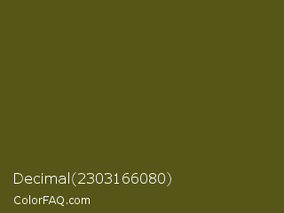 Decimal 2303166080 Color is a very dark yellow color and the nearest color is Saratoga #555b10. Hex code #555618 and RGB value is rgb(85,86,24). In RGB color space, this color is composed of 33% red, 34% green, 9% blue, In CMYK color space, this color is composed of 1% cyan, 0% magenta, 72% yellow , 66% black , In HSL color space, this color has a hue angle of 61° , 56% saturation and 22% lightness.