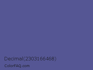 Decimal 2303166468 Color is a normal blue color and the nearest color is Butterfly Bush #624e9a. Hex code #555694 and RGB value is rgb(85,86,148). In RGB color space, this color is composed of 33% red, 34% green, 58% blue, In CMYK color space, this color is composed of 43% cyan, 42% magenta, 0% yellow , 42% black , In HSL color space, this color has a hue angle of 239° , 27% saturation and 46% lightness.