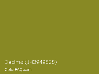 Decimal 143949828 Color is a normal yellow color and the nearest color is Trendy Green #7c881a. Hex code #888924 and RGB value is rgb(136,137,36). In RGB color space, this color is composed of 53% red, 54% green, 14% blue, In CMYK color space, this color is composed of 1% cyan, 0% magenta, 74% yellow , 46% black , In HSL color space, this color has a hue angle of 61° , 58% saturation and 34% lightness.
