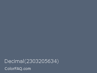 Decimal 2303205634 Color is a normal blue color and the nearest color is Paynes Grey #536878. Hex code #556376 and RGB value is rgb(85,99,118). In RGB color space, this color is composed of 33% red, 39% green, 46% blue, In CMYK color space, this color is composed of 28% cyan, 16% magenta, 0% yellow , 54% black , In HSL color space, this color has a hue angle of 215° , 16% saturation and 40% lightness.