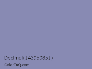 Decimal 143950851 Color is a light blue color and the nearest color is Cool Grey #8c92ac. Hex code #888ab3 and RGB value is rgb(136,138,179). In RGB color space, this color is composed of 53% red, 54% green, 70% blue, In CMYK color space, this color is composed of 24% cyan, 23% magenta, 0% yellow , 30% black , In HSL color space, this color has a hue angle of 237° , 22% saturation and 62% lightness.