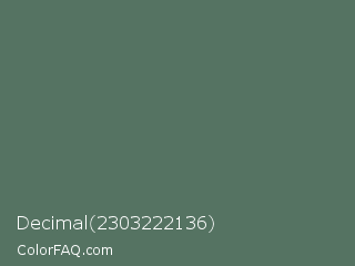 Decimal 2303222136 Color is a normal green color and the nearest color is Como #517c66. Hex code #557362 and RGB value is rgb(85,115,98). In RGB color space, this color is composed of 33% red, 45% green, 38% blue, In CMYK color space, this color is composed of 26% cyan, 0% magenta, 15% yellow , 55% black , In HSL color space, this color has a hue angle of 146° , 15% saturation and 39% lightness.