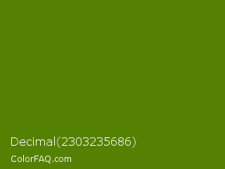 Decimal 2303235686 Color is a dark green color and the nearest color is Avocado #568203. Hex code #558102 and RGB value is rgb(85,129,2). In RGB color space, this color is composed of 33% red, 51% green, 1% blue, In CMYK color space, this color is composed of 34% cyan, 0% magenta, 98% yellow , 49% black , In HSL color space, this color has a hue angle of 81° , 97% saturation and 26% lightness.