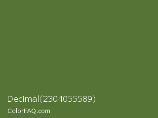 Decimal 2304055589 Color is a normal green color and the nearest color is Dark Olive Green #556b2f. Hex code #567435 and RGB value is rgb(86,116,53). In RGB color space, this color is composed of 34% red, 45% green, 21% blue, In CMYK color space, this color is composed of 26% cyan, 0% magenta, 54% yellow , 55% black , In HSL color space, this color has a hue angle of 89° , 37% saturation and 33% lightness.