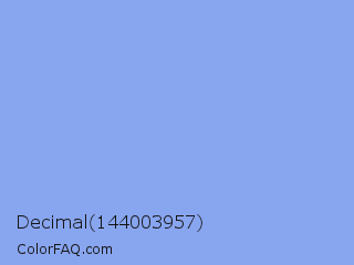 Decimal 144003957 Color is a light blue color and the nearest color is Portage #8b9fee. Hex code #88a5ef and RGB value is rgb(136,165,239). In RGB color space, this color is composed of 53% red, 65% green, 94% blue, In CMYK color space, this color is composed of 43% cyan, 31% magenta, 0% yellow , 6% black , In HSL color space, this color has a hue angle of 223° , 76% saturation and 74% lightness.