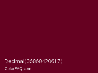Decimal 36868420617 Color is a very dark rose color and the nearest color is Bordeaux #5c0120. Hex code #660121 and RGB value is rgb(102,1,33). In RGB color space, this color is composed of 40% red, 0% green, 13% blue, In CMYK color space, this color is composed of 0% cyan, 99% magenta, 68% yellow , 60% black , In HSL color space, this color has a hue angle of 341° , 98% saturation and 20% lightness.
