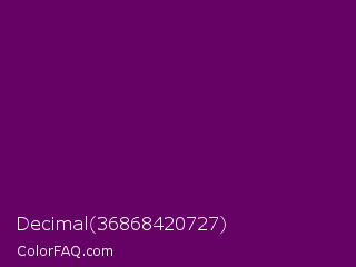Decimal 36868420727 Color is a very dark magenta color and the nearest color is Pompadour #660045. Hex code #660165 and RGB value is rgb(102,1,101). In RGB color space, this color is composed of 40% red, 0% green, 40% blue, In CMYK color space, this color is composed of 0% cyan, 99% magenta, 1% yellow , 60% black , In HSL color space, this color has a hue angle of 301° , 98% saturation and 20% lightness.