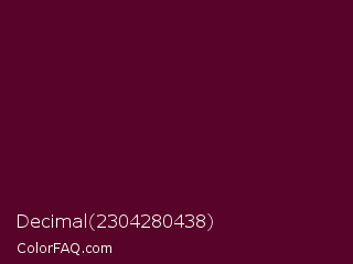 Decimal 2304280438 Color is a very dark rose color and the nearest color is Bordeaux #5c0120. Hex code #570428 and RGB value is rgb(87,4,40). In RGB color space, this color is composed of 34% red, 2% green, 16% blue, In CMYK color space, this color is composed of 0% cyan, 95% magenta, 54% yellow , 66% black , In HSL color space, this color has a hue angle of 334° , 91% saturation and 18% lightness.