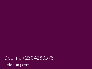 Decimal 2304280578 Color is a very dark magenta color and the nearest color is Mulberry Wood #5c0536. Hex code #570442 and RGB value is rgb(87,4,66). In RGB color space, this color is composed of 34% red, 2% green, 26% blue, In CMYK color space, this color is composed of 0% cyan, 95% magenta, 24% yellow , 66% black , In HSL color space, this color has a hue angle of 315° , 91% saturation and 18% lightness.