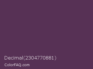 Decimal 2304770881 Color is a dark magenta color and the nearest color is Japanese Violet #5b3256. Hex code #573155 and RGB value is rgb(87,49,85). In RGB color space, this color is composed of 34% red, 19% green, 33% blue, In CMYK color space, this color is composed of 0% cyan, 44% magenta, 2% yellow , 66% black , In HSL color space, this color has a hue angle of 303° , 28% saturation and 27% lightness.