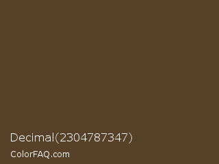 Decimal 2304787347 Color is a dark orange color and the nearest color is Irish Coffee #5f3d26. Hex code #574129 and RGB value is rgb(87,65,41). In RGB color space, this color is composed of 34% red, 25% green, 16% blue, In CMYK color space, this color is composed of 0% cyan, 25% magenta, 53% yellow , 66% black , In HSL color space, this color has a hue angle of 31° , 36% saturation and 25% lightness.