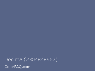 Decimal 2304848967 Color is a normal blue color and the nearest color is UCLA Blue #536895. Hex code #576487 and RGB value is rgb(87,100,135). In RGB color space, this color is composed of 34% red, 39% green, 53% blue, In CMYK color space, this color is composed of 36% cyan, 26% magenta, 0% yellow , 47% black , In HSL color space, this color has a hue angle of 224° , 22% saturation and 44% lightness.