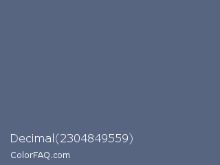 Decimal 2304849559 Color is a normal blue color and the nearest color is Paynes Grey #536878. Hex code #576581 and RGB value is rgb(87,101,129). In RGB color space, this color is composed of 34% red, 40% green, 51% blue, In CMYK color space, this color is composed of 33% cyan, 22% magenta, 0% yellow , 49% black , In HSL color space, this color has a hue angle of 220° , 19% saturation and 42% lightness.