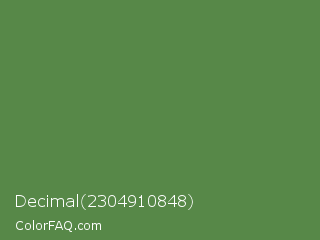 Decimal 2304910848 Color is a normal green color and the nearest color is Hippie Green #53824b. Hex code #578848 and RGB value is rgb(87,136,72). In RGB color space, this color is composed of 34% red, 53% green, 28% blue, In CMYK color space, this color is composed of 36% cyan, 0% magenta, 47% yellow , 47% black , In HSL color space, this color has a hue angle of 106° , 31% saturation and 41% lightness.