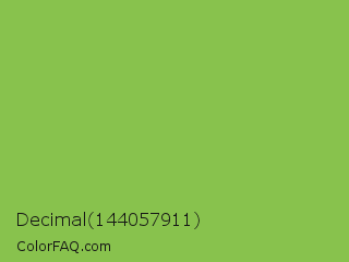 Decimal 144057911 Color is a normal green color and the nearest color is Dollar Bill #85bb65. Hex code #88c24d and RGB value is rgb(136,194,77). In RGB color space, this color is composed of 53% red, 76% green, 30% blue, In CMYK color space, this color is composed of 30% cyan, 0% magenta, 60% yellow , 24% black , In HSL color space, this color has a hue angle of 90° , 49% saturation and 53% lightness.