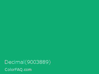 Decimal 9003889 Color is a normal green color and the nearest color is Green Munsell #00a877. Hex code #0dad73 and RGB value is rgb(13,173,115). In RGB color space, this color is composed of 5% red, 68% green, 45% blue, In CMYK color space, this color is composed of 92% cyan, 0% magenta, 34% yellow , 32% black , In HSL color space, this color has a hue angle of 158° , 86% saturation and 36% lightness.