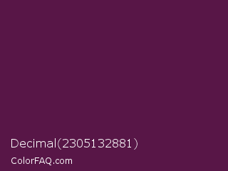 Decimal 2305132881 Color is a very dark magenta color and the nearest color is Wine Berry #591d35. Hex code #581647 and RGB value is rgb(88,22,71). In RGB color space, this color is composed of 35% red, 9% green, 28% blue, In CMYK color space, this color is composed of 0% cyan, 75% magenta, 19% yellow , 65% black , In HSL color space, this color has a hue angle of 315° , 60% saturation and 22% lightness.