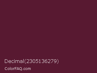 Decimal 2305136279 Color is a very dark rose color and the nearest color is Wine Berry #591d35. Hex code #581931 and RGB value is rgb(88,25,49). In RGB color space, this color is composed of 35% red, 10% green, 19% blue, In CMYK color space, this color is composed of 0% cyan, 72% magenta, 44% yellow , 65% black , In HSL color space, this color has a hue angle of 337° , 56% saturation and 22% lightness.
