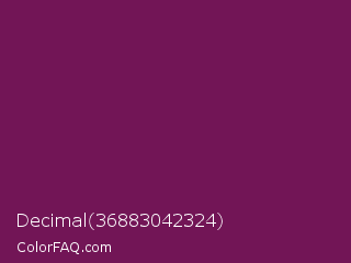 Decimal 36883042324 Color is a dark magenta color and the nearest color is Pansy Purple #78184a. Hex code #721556 and RGB value is rgb(114,21,86). In RGB color space, this color is composed of 45% red, 8% green, 34% blue, In CMYK color space, this color is composed of 0% cyan, 82% magenta, 25% yellow , 55% black , In HSL color space, this color has a hue angle of 318° , 69% saturation and 26% lightness.