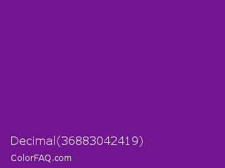 Decimal 36883042419 Color is a normal purple color and the nearest color is Seance #731e8f. Hex code #721591 and RGB value is rgb(114,21,145). In RGB color space, this color is composed of 45% red, 8% green, 57% blue, In CMYK color space, this color is composed of 21% cyan, 86% magenta, 0% yellow , 43% black , In HSL color space, this color has a hue angle of 285° , 75% saturation and 33% lightness.