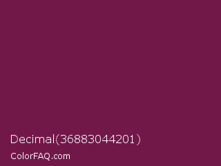 Decimal 36883044201 Color is a dark magenta color and the nearest color is Pansy Purple #78184a. Hex code #721849 and RGB value is rgb(114,24,73). In RGB color space, this color is composed of 45% red, 9% green, 29% blue, In CMYK color space, this color is composed of 0% cyan, 79% magenta, 36% yellow , 55% black , In HSL color space, this color has a hue angle of 327° , 65% saturation and 27% lightness.