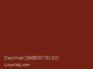 Decimal 36883079192 Color is a dark red color and the nearest color is Moccaccino #6e1d14. Hex code #722112 and RGB value is rgb(114,33,18). In RGB color space, this color is composed of 45% red, 13% green, 7% blue, In CMYK color space, this color is composed of 0% cyan, 71% magenta, 84% yellow , 55% black , In HSL color space, this color has a hue angle of 9° , 73% saturation and 26% lightness.