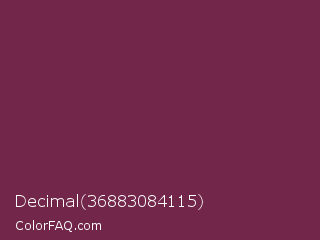 Decimal 36883084115 Color is a dark rose color and the nearest color is Tawny Port #692545. Hex code #722649 and RGB value is rgb(114,38,73). In RGB color space, this color is composed of 45% red, 15% green, 29% blue, In CMYK color space, this color is composed of 0% cyan, 67% magenta, 36% yellow , 55% black , In HSL color space, this color has a hue angle of 332° , 50% saturation and 30% lightness.
