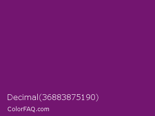 Decimal 36883875190 Color is a dark magenta color and the nearest color is Midnight #702670. Hex code #731570 and RGB value is rgb(115,21,112). In RGB color space, this color is composed of 45% red, 8% green, 44% blue, In CMYK color space, this color is composed of 0% cyan, 82% magenta, 3% yellow , 55% black , In HSL color space, this color has a hue angle of 302° , 69% saturation and 27% lightness.