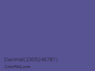 Decimal 2305246787 Color is a normal indigo color and the nearest color is Butterfly Bush #624e9a. Hex code #585393 and RGB value is rgb(88,83,147). In RGB color space, this color is composed of 35% red, 33% green, 58% blue, In CMYK color space, this color is composed of 40% cyan, 44% magenta, 0% yellow , 42% black , In HSL color space, this color has a hue angle of 245° , 28% saturation and 45% lightness.
