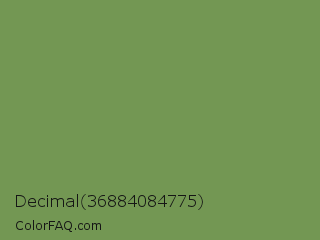 Decimal 36884084775 Color is a normal green color and the nearest color is Asparagus Green #7ba05b. Hex code #739753 and RGB value is rgb(115,151,83). In RGB color space, this color is composed of 45% red, 59% green, 33% blue, In CMYK color space, this color is composed of 24% cyan, 0% magenta, 45% yellow , 41% black , In HSL color space, this color has a hue angle of 92° , 29% saturation and 46% lightness.