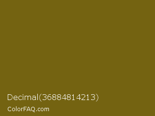 Decimal 36884814213 Color is a dark yellow color and the nearest color is Spicy Mustard #74640d. Hex code #746311 and RGB value is rgb(116,99,17). In RGB color space, this color is composed of 45% red, 39% green, 7% blue, In CMYK color space, this color is composed of 0% cyan, 15% magenta, 85% yellow , 55% black , In HSL color space, this color has a hue angle of 50° , 74% saturation and 26% lightness.
