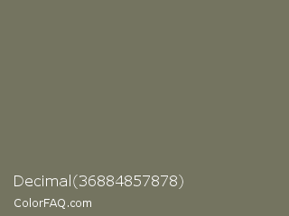 Decimal 36884857878 Color is a normal yellow color and the nearest color is Pablo #776f61. Hex code #747460 and RGB value is rgb(116,116,96). In RGB color space, this color is composed of 45% red, 45% green, 38% blue, In CMYK color space, this color is composed of 0% cyan, 0% magenta, 17% yellow , 55% black , In HSL color space, this color has a hue angle of 60° , 9% saturation and 42% lightness.