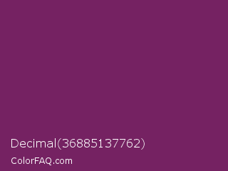 Decimal 36885137762 Color is a dark magenta color and the nearest color is Byzantium #702963. Hex code #752262 and RGB value is rgb(117,34,98). In RGB color space, this color is composed of 46% red, 13% green, 38% blue, In CMYK color space, this color is composed of 0% cyan, 71% magenta, 16% yellow , 54% black , In HSL color space, this color has a hue angle of 314° , 55% saturation and 30% lightness.