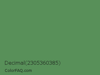 Decimal 2305360385 Color is a normal green color and the nearest color is Middle Green #4d8c57. Hex code #589059 and RGB value is rgb(88,144,89). In RGB color space, this color is composed of 35% red, 56% green, 35% blue, In CMYK color space, this color is composed of 39% cyan, 0% magenta, 38% yellow , 44% black , In HSL color space, this color has a hue angle of 121° , 24% saturation and 45% lightness.