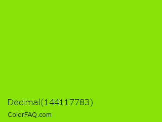 Decimal 144117783 Color is a normal green color and the nearest color is Alien Armpit #84de02. Hex code #88e309 and RGB value is rgb(136,227,9). In RGB color space, this color is composed of 53% red, 89% green, 4% blue, In CMYK color space, this color is composed of 40% cyan, 0% magenta, 96% yellow , 11% black , In HSL color space, this color has a hue angle of 85° , 92% saturation and 46% lightness.