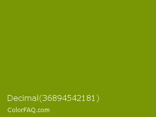 Decimal 36894542181 Color is a normal lime color and the nearest color is Limeade #6f9d02. Hex code #799705 and RGB value is rgb(121,151,5). In RGB color space, this color is composed of 47% red, 59% green, 2% blue, In CMYK color space, this color is composed of 20% cyan, 0% magenta, 97% yellow , 41% black , In HSL color space, this color has a hue angle of 72° , 94% saturation and 31% lightness.