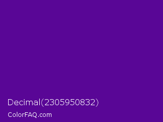 Decimal 2305950832 Color is a normal purple color and the nearest color is Purple #660099. Hex code #590696 and RGB value is rgb(89,6,150). In RGB color space, this color is composed of 35% red, 2% green, 59% blue, In CMYK color space, this color is composed of 41% cyan, 96% magenta, 0% yellow , 41% black , In HSL color space, this color has a hue angle of 275° , 92% saturation and 31% lightness.