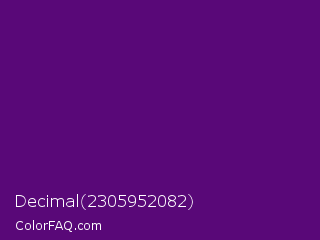Decimal 2305952082 Color is a dark purple color and the nearest color is Pigment Indigo #4b0082. Hex code #590878 and RGB value is rgb(89,8,120). In RGB color space, this color is composed of 35% red, 3% green, 47% blue, In CMYK color space, this color is composed of 26% cyan, 93% magenta, 0% yellow , 53% black , In HSL color space, this color has a hue angle of 283° , 88% saturation and 25% lightness.