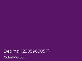 Decimal 2305963857 Color is a dark purple color and the nearest color is Honey Flower #4f1c70. Hex code #591367 and RGB value is rgb(89,19,103). In RGB color space, this color is composed of 35% red, 7% green, 40% blue, In CMYK color space, this color is composed of 14% cyan, 82% magenta, 0% yellow , 60% black , In HSL color space, this color has a hue angle of 290° , 69% saturation and 24% lightness.