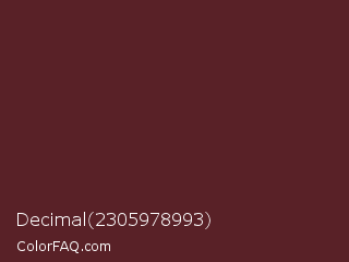 Decimal 2305978993 Color is a dark red color and the nearest color is Caput Mortuum #592720. Hex code #592127 and RGB value is rgb(89,33,39). In RGB color space, this color is composed of 35% red, 13% green, 15% blue, In CMYK color space, this color is composed of 0% cyan, 63% magenta, 56% yellow , 65% black , In HSL color space, this color has a hue angle of 354° , 46% saturation and 24% lightness.