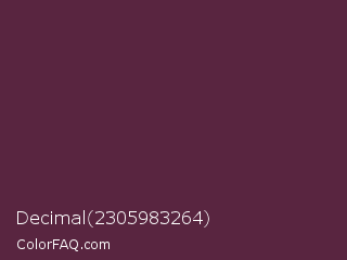 Decimal 2305983264 Color is a dark rose color and the nearest color is Wine Berry #591d35. Hex code #592540 and RGB value is rgb(89,37,64). In RGB color space, this color is composed of 35% red, 15% green, 25% blue, In CMYK color space, this color is composed of 0% cyan, 58% magenta, 28% yellow , 65% black , In HSL color space, this color has a hue angle of 329° , 41% saturation and 25% lightness.