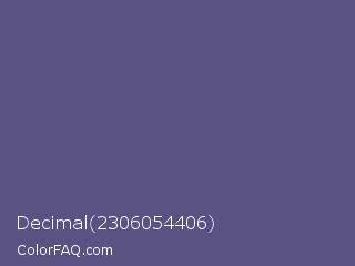 Decimal 2306054406 Color is a normal indigo color and the nearest color is Purple Navy #4e5180. Hex code #595282 and RGB value is rgb(89,82,130). In RGB color space, this color is composed of 35% red, 32% green, 51% blue, In CMYK color space, this color is composed of 32% cyan, 37% magenta, 0% yellow , 49% black , In HSL color space, this color has a hue angle of 249° , 23% saturation and 42% lightness.