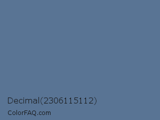 Decimal 2306115112 Color is a normal blue color and the nearest color is Waikawa Gray #5a6e9c. Hex code #597494 and RGB value is rgb(89,116,148). In RGB color space, this color is composed of 35% red, 45% green, 58% blue, In CMYK color space, this color is composed of 40% cyan, 22% magenta, 0% yellow , 42% black , In HSL color space, this color has a hue angle of 213° , 25% saturation and 46% lightness.