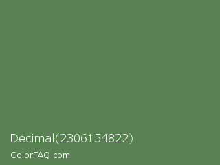 Decimal 2306154822 Color is a normal green color and the nearest color is Hippie Green #53824b. Hex code #598252 and RGB value is rgb(89,130,82). In RGB color space, this color is composed of 35% red, 51% green, 32% blue, In CMYK color space, this color is composed of 32% cyan, 0% magenta, 37% yellow , 49% black , In HSL color space, this color has a hue angle of 111° , 23% saturation and 42% lightness.