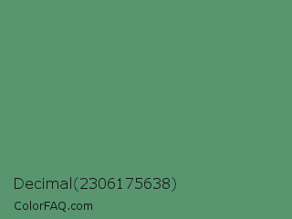 Decimal 2306175638 Color is a normal green color and the nearest color is Russian Green #679267. Hex code #599670 and RGB value is rgb(89,150,112). In RGB color space, this color is composed of 35% red, 59% green, 44% blue, In CMYK color space, this color is composed of 41% cyan, 0% magenta, 25% yellow , 41% black , In HSL color space, this color has a hue angle of 143° , 26% saturation and 47% lightness.