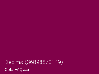 Decimal 36898870149 Color is a dark magenta color and the nearest color is Rose Bud Cherry #800b47. Hex code #800149 and RGB value is rgb(128,1,73). In RGB color space, this color is composed of 50% red, 0% green, 29% blue, In CMYK color space, this color is composed of 0% cyan, 99% magenta, 43% yellow , 50% black , In HSL color space, this color has a hue angle of 326° , 98% saturation and 25% lightness.